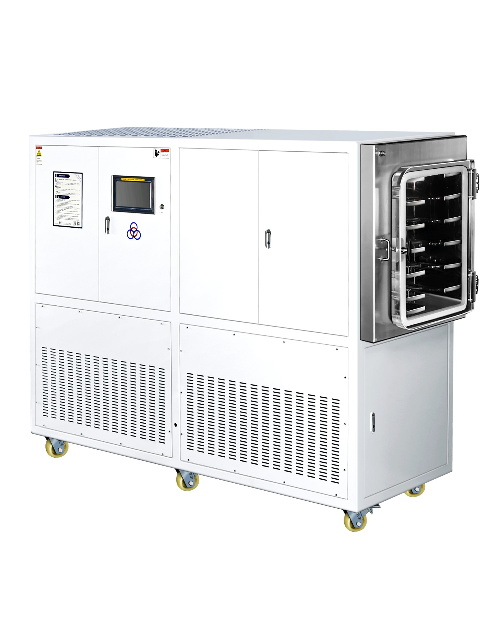 9、外置冷阱提高设备的捕水能力,减少冻干过程中冷阱温度对物 料的干扰,保证物料冻干质量一致和实验数据稳定,提高冻干 效率,降低能源损耗;